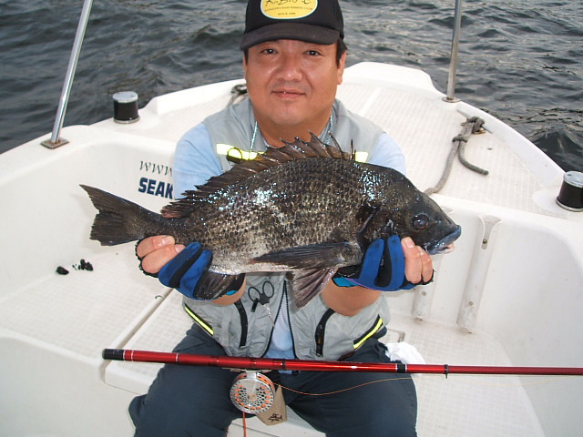 いいペースでアタリは続くが、途中、濃霧となって休憩。霧が晴れて移動したポイントでもアタリは頻繁。ひったくっていくようなアタリも多かった。 このエリアの黒鯛も魚影抜群!