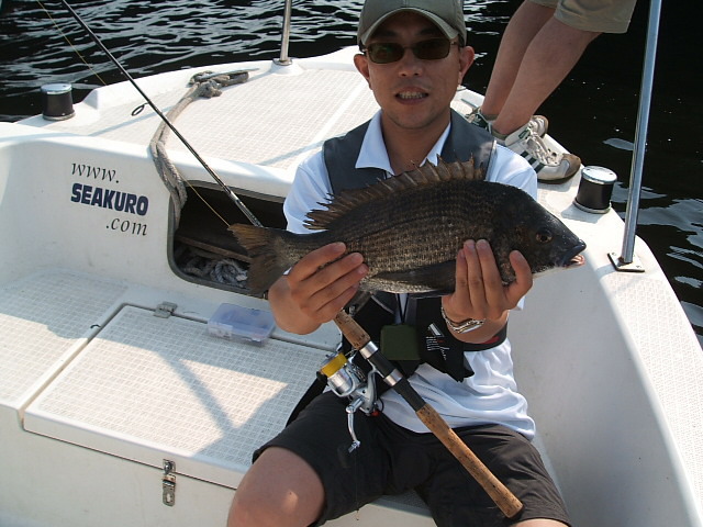 カラス貝を付けてスピンピッチしたお客様には連発でヒット。「人生初黒鯛」をお見事キャッチ。
