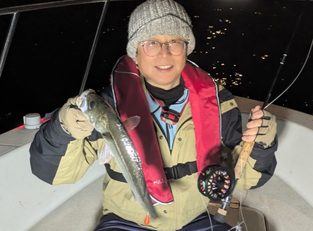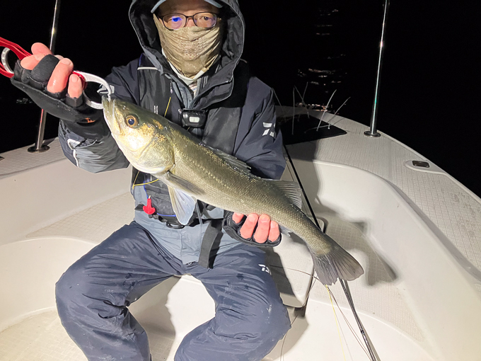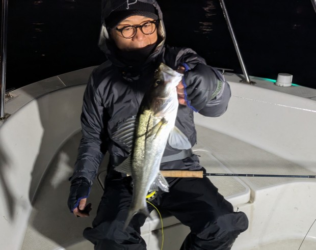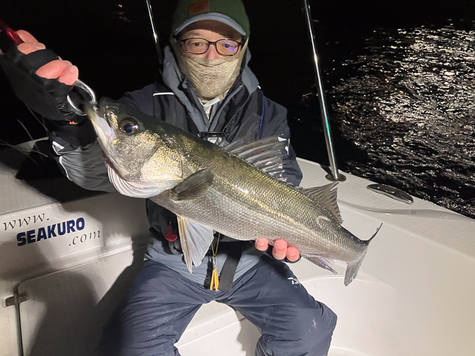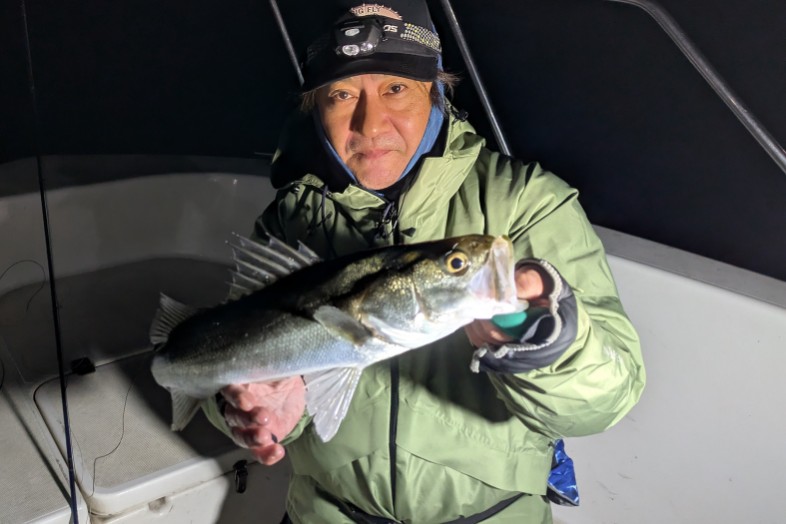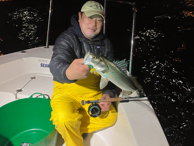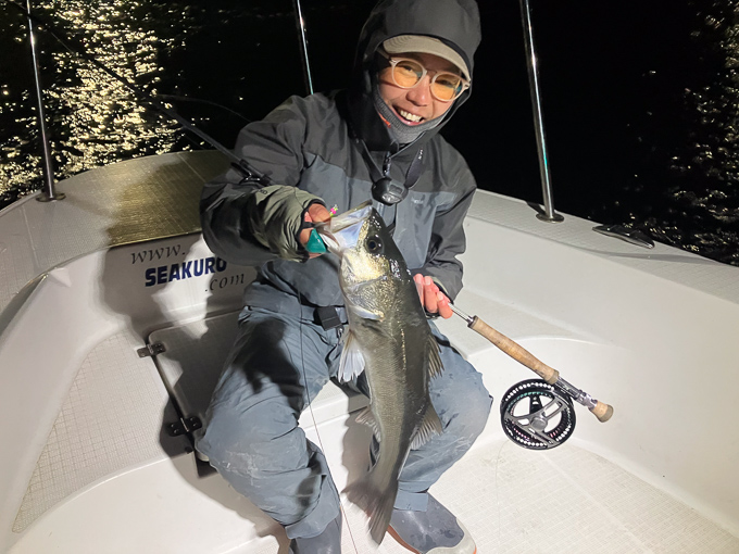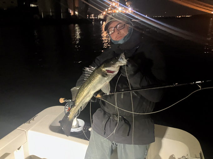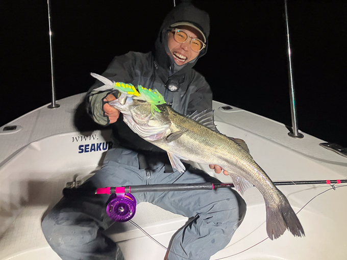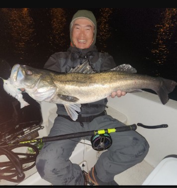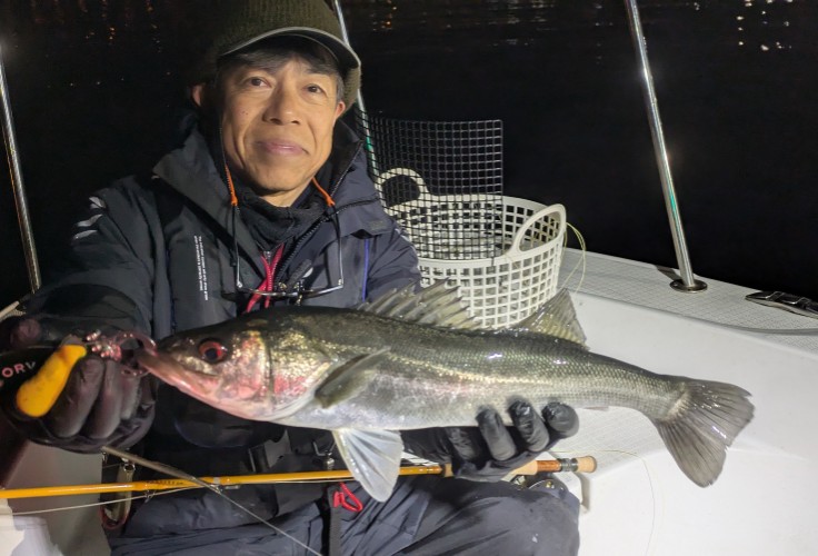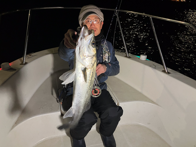 今年は早期から終了まで、70前後の安定した釣果があり、自信が持てたシーズンでした。これもキャプテンの励ましやアドバイスのおかげ様です。深夜、早朝問わず出船いただけるスーパーキャプテン達には感謝しかありません。ありがとうございます。 今年の最大サイズは岡本キャプテンの操船時でした。乗船前に自分のやりたいことや希望を聞いていただき、各ポイントを巡り釣りをしますがノーバイト。いつものように時間が過ぎていきました。暗闇にキャストしてはリトリーブを繰り返す無情の時、やっぱりビッグフライは甘くないなと、いつもの無心キャスト状態になっていた時、岡本キャプテンが今気になる、最も有望であろうポイントに移動。 その時は突然やってきました。ズドン!と糸を押さえ込まれる猛烈バイト!極太のランカーシーバスは凄いファイトでしたが、なんとかいなしてタモ入れに成功!歓喜の雄叫びを上げました。一緒に喜んでくれる岡本キャプテン。本当にこの釣りをやっていて良かったと思える瞬間でした。
