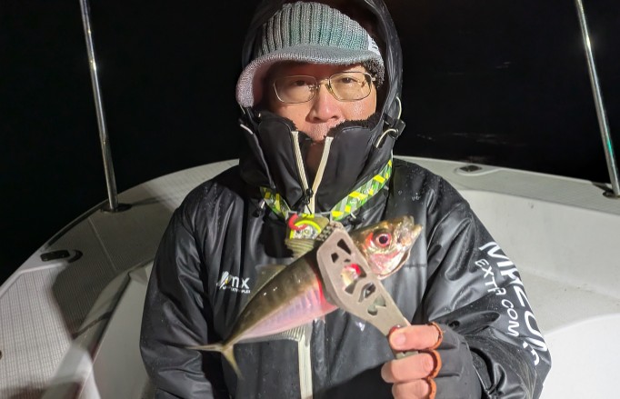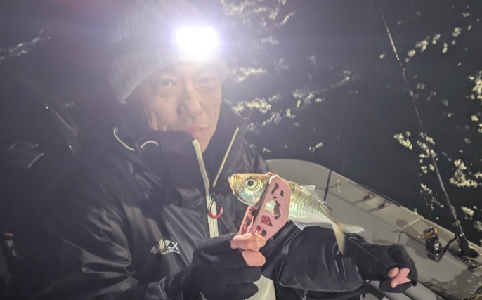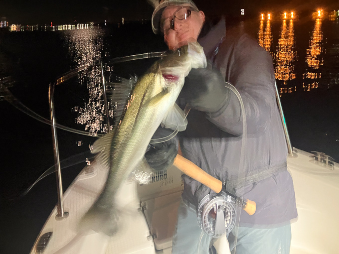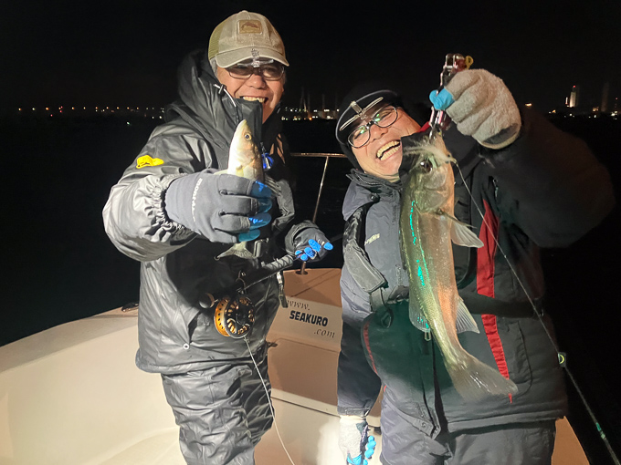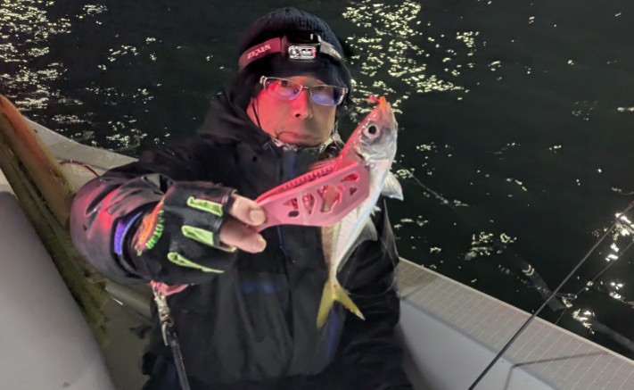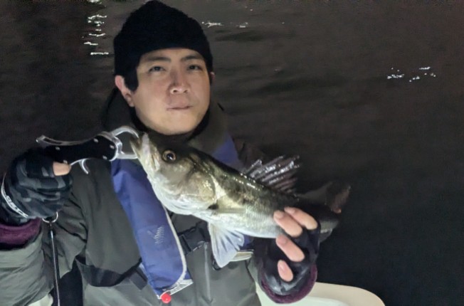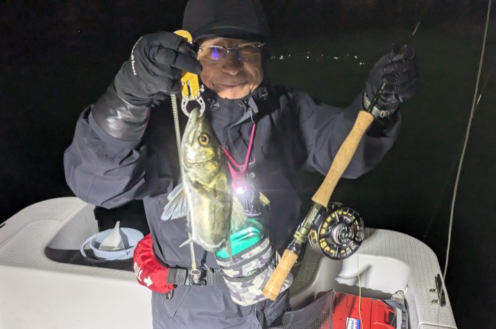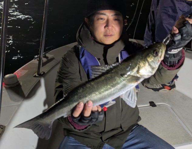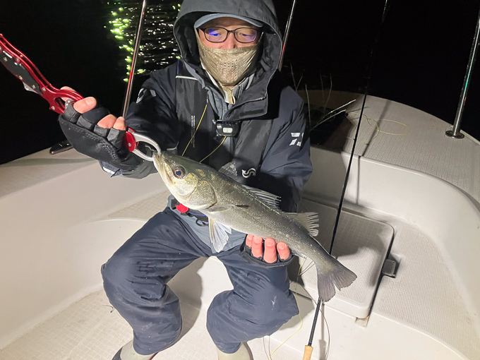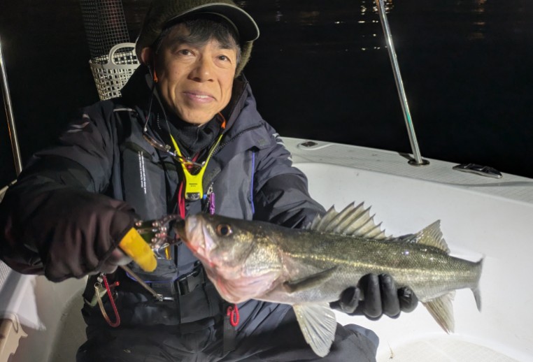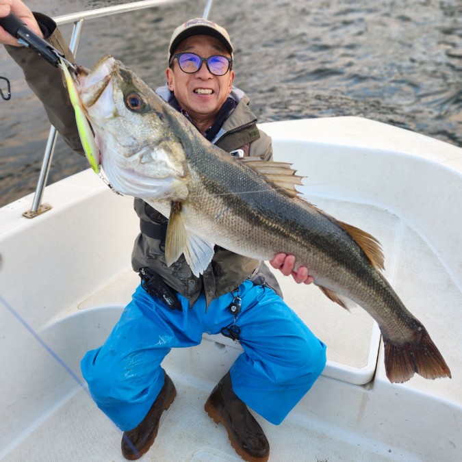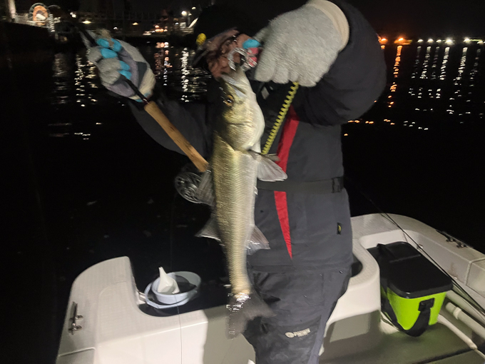 今年は早期から終了まで、70前後の安定した釣果があり、自信が持てたシーズンでした。これもキャプテンの励ましやアドバイスのおかげ様です。深夜、早朝問わず出船いただけるスーパーキャプテン達には感謝しかありません。ありがとうございます。 今年の最大サイズは岡本キャプテンの操船時でした。乗船前に自分のやりたいことや希望を聞いていただき、各ポイントを巡り釣りをしますがノーバイト。いつものように時間が過ぎていきました。暗闇にキャストしてはリトリーブを繰り返す無情の時、やっぱりビッグフライは甘くないなと、いつもの無心キャスト状態になっていた時、岡本キャプテンが今気になる、最も有望であろうポイントに移動。 その時は突然やってきました。ズドン!と糸を押さえ込まれる猛烈バイト!極太のランカーシーバスは凄いファイトでしたが、なんとかいなしてタモ入れに成功!歓喜の雄叫びを上げました。一緒に喜んでくれる岡本キャプテン。本当にこの釣りをやっていて良かったと思える瞬間でした。