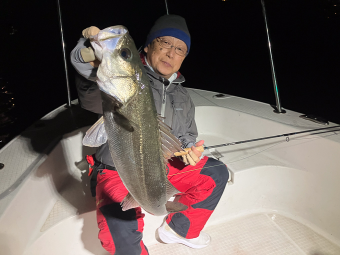 夜も更けてからベイエリアでビッグベイトとビッグフライで各所をサーチ。やや沈めたビッグベイトに反応良く最大80cmをキャッチ!スローなコンディションでしたが精度の良い丁寧な釣り、お見事でした!!