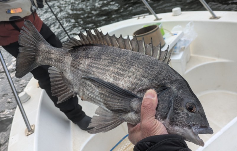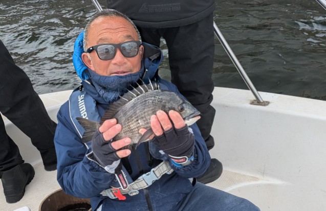 各ポイントでじっくり蟹エサを落とし込み、微かなアタリを捉えて寒チヌをキャッチ!