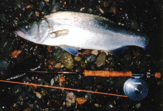 私が休日・平日を問わず、あまりにもしょっちゅう遠くから通ってくるもので、地元の年配ヒラスズキ仲間も半ば呆れ気味でしたが、後日に彼から贈られた「いやぁ岡本君、20数年こんなヒラスズキ見たことないよ。その頑張りぶり、おテントウ様が見てくれてたのかもな・・・」という言葉は今でも心に残っています。 釣ったモンスター・ヒラスズキと共に小1時間横になって贅沢な時間を過ごした後、再度検量したところ目方が8キロに減っていました。今まで「魚が短縮した」とか「乾燥して軽くなった」など聞いても半信半疑でしたが、そんなこともあるもんだと不思議な実体験をしました。 唯一後悔していることは、そのヒラスズキをリリースできなかったことです・・・。 97センチにまで成長するのにかかった年月や、自分のルアーにヒットしてくれたことへの感謝、リリースすれば一生自分の心の中で泳ぎ続けることからも、現在では「あの時リリースすればよかった・・・」と個人的に感じています。 その後、ヒラスズキ熱は更にヒートアップしてしまい、より難しい釣法【フライフィッシング】でヒラスズキを狙う艱難辛苦が始まることになりました。 |